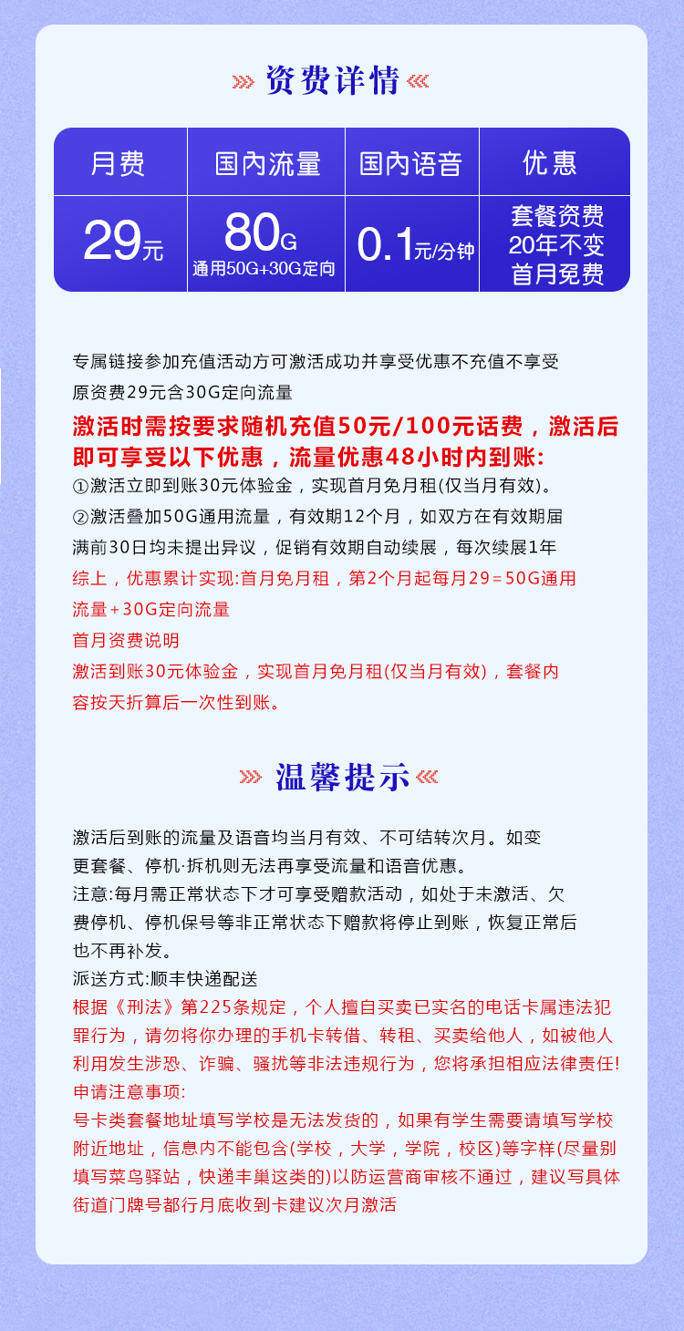 - 首月免月租(通过体验金实现),第 2 个月起每月 29 元,含 50G 通用流量 + 30G 定向流量,优惠期 12 个月(到期前 30 天未异议则自动续展 1 年)。