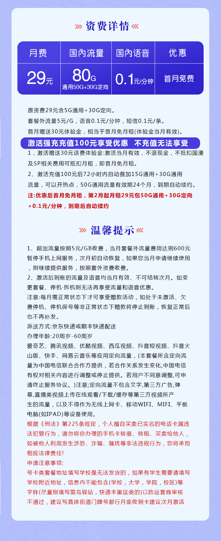- 第 2 月起:29 元 / 月 = 50G 通用 + 30G 定向 + 语音 0.1 元 / 分钟,到期自动续约。
