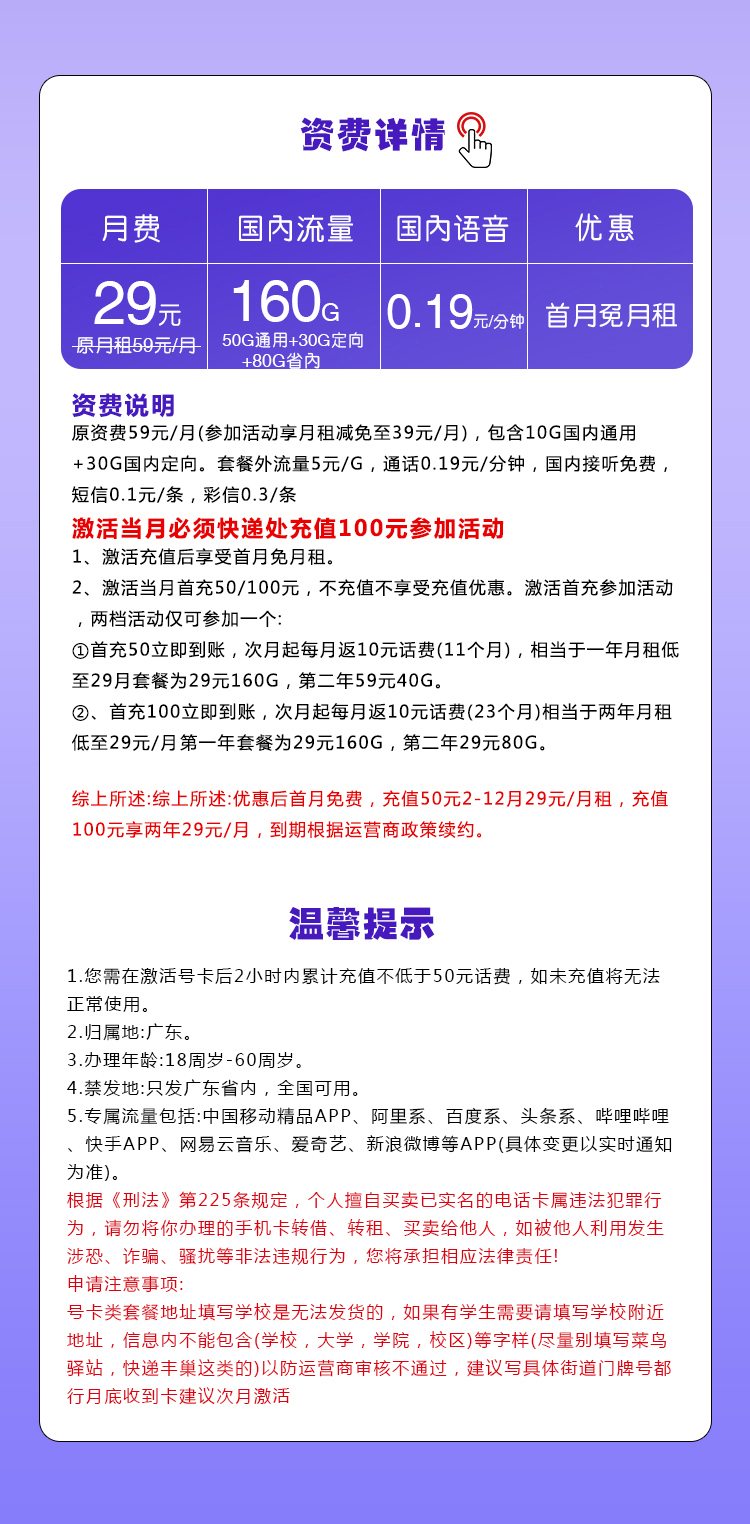 - 激活充值时效:激活号卡后 2 小时内累计充值不低于 50 元,否则无法正常使用。