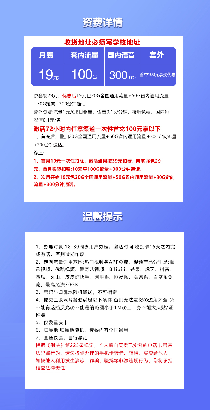 - 充值链接:激活号卡后,72 小时内通过激活单页 / 充值链接首充 100 元(必充,否则无优惠)。