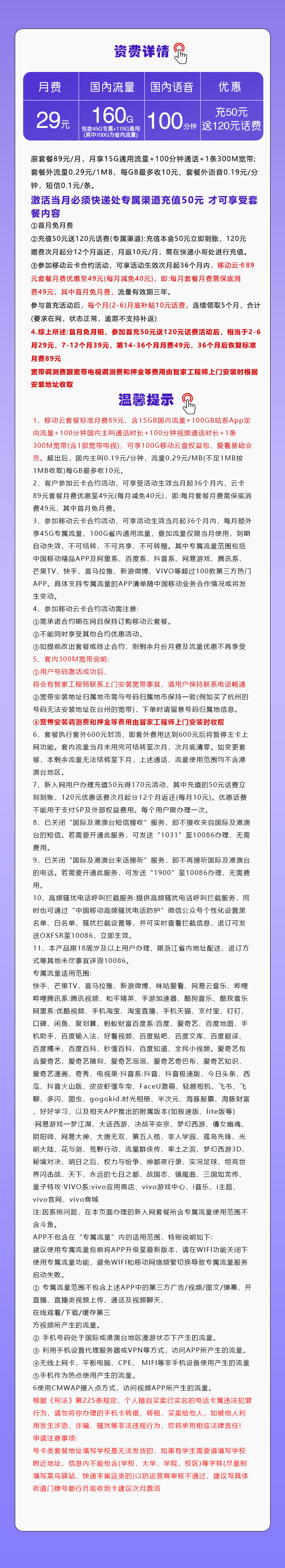 - 套餐外收费标准:流量 0.29 元 / 1MB(每 GB 最高收 10 元),语音 0.19 元 / 分钟,短信 0.1 元 / 条。