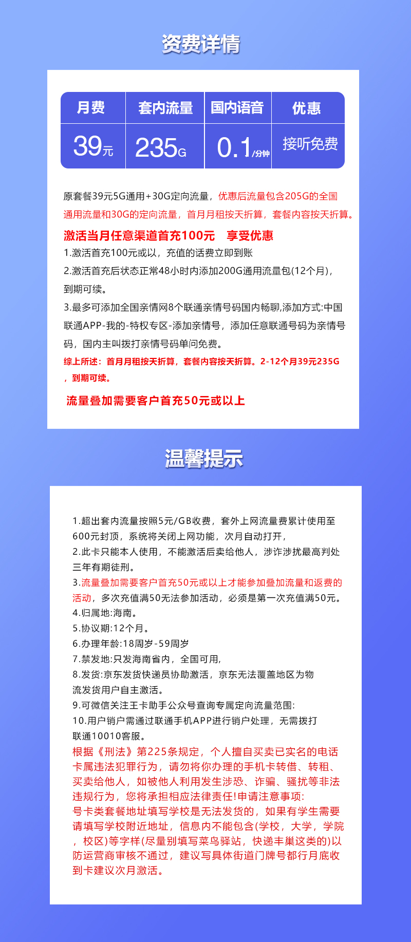 原套餐为 39 元 / 月,包含 5G 全国通用流量 + 30G 定向流量。优惠后(2-12 个月)39 元 / 月可享 205G 全国通用流量 + 30G 定向流量,到期支持续期。首月套餐月租与内容均按天折算。