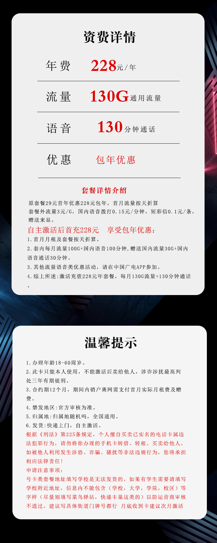 - 激活后充值 228 元包年费用,即可每月固定享受 130G 流量 + 130 分钟通话;