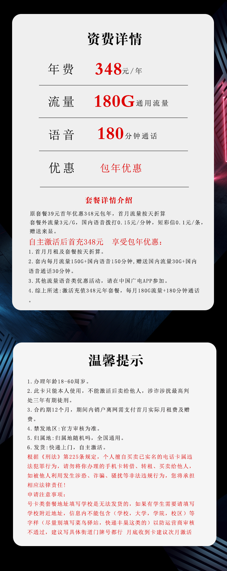 - 激活要求:激活时需充值 348 元包年费用,方可享受优惠