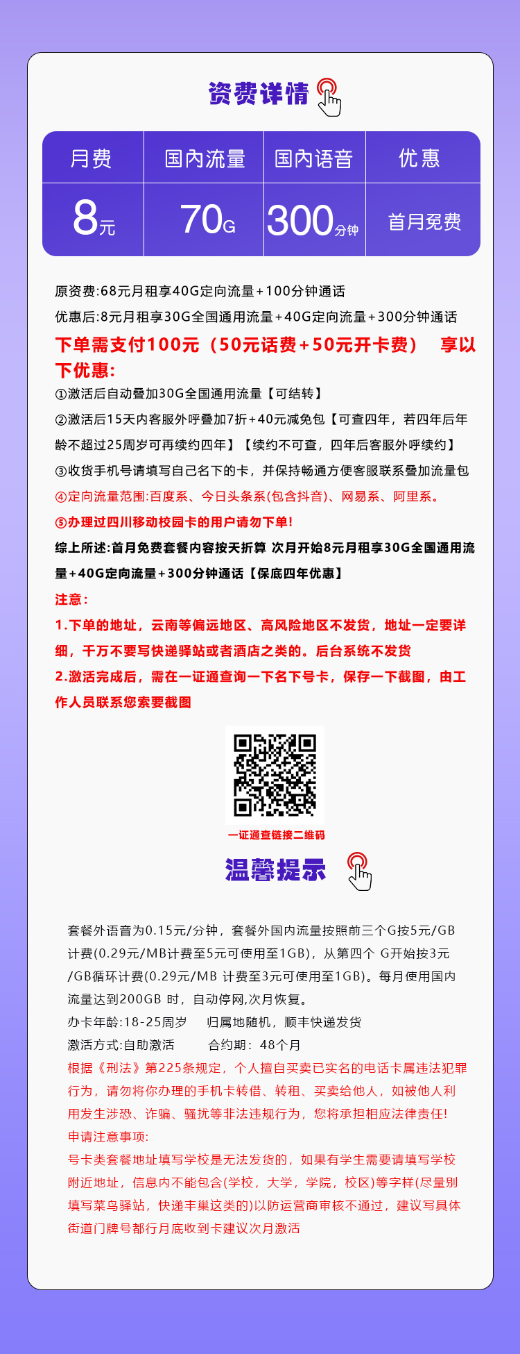 - 禁止下单人群:办理过四川移动校园卡的用户不可下单。
