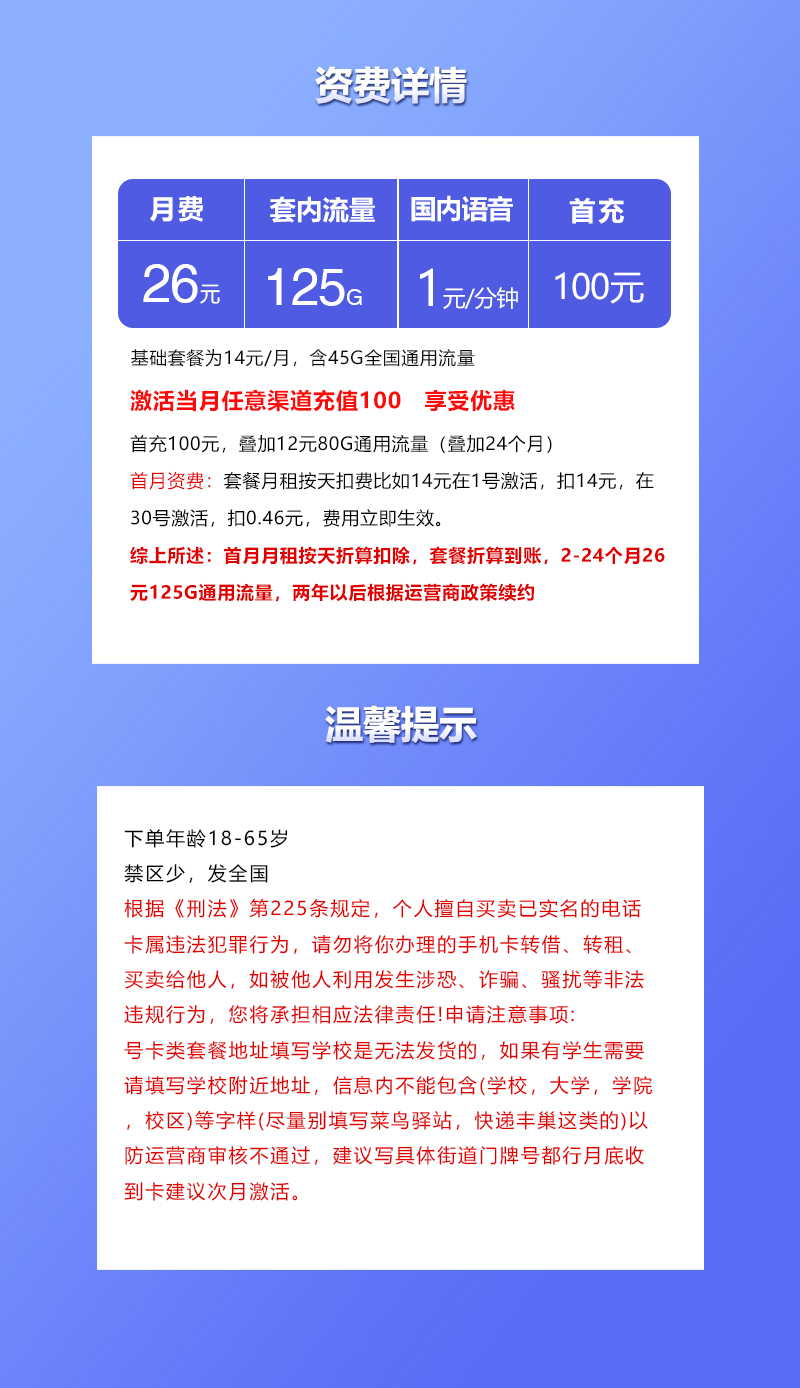 - 第 2-24 个月:每月 26 元享 125G 通用流量(45G 基础 + 80G 叠加)。