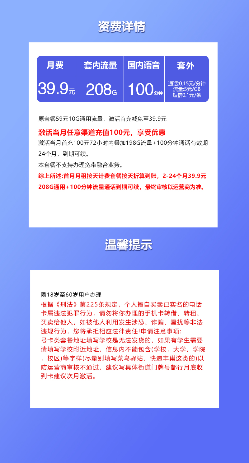 - 长期套餐内容(2-24 个月):39.9 元 = 208G 通用流量 + 100 分钟通话,到期可续。