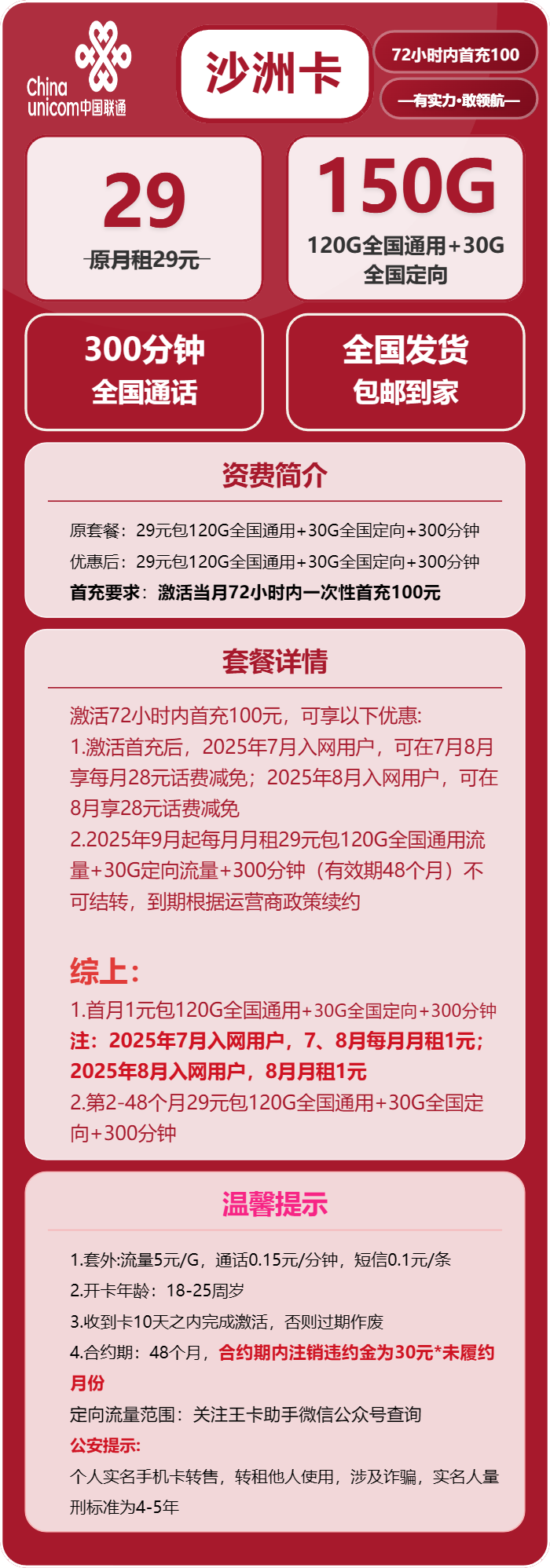 联通沙洲卡套餐到底好不好呢?它是中国联通推出的一款手机流量卡,每月29元就能享受150G流量和300分钟通话。下面就来给大家介绍下这个套餐的详情和申请方式!