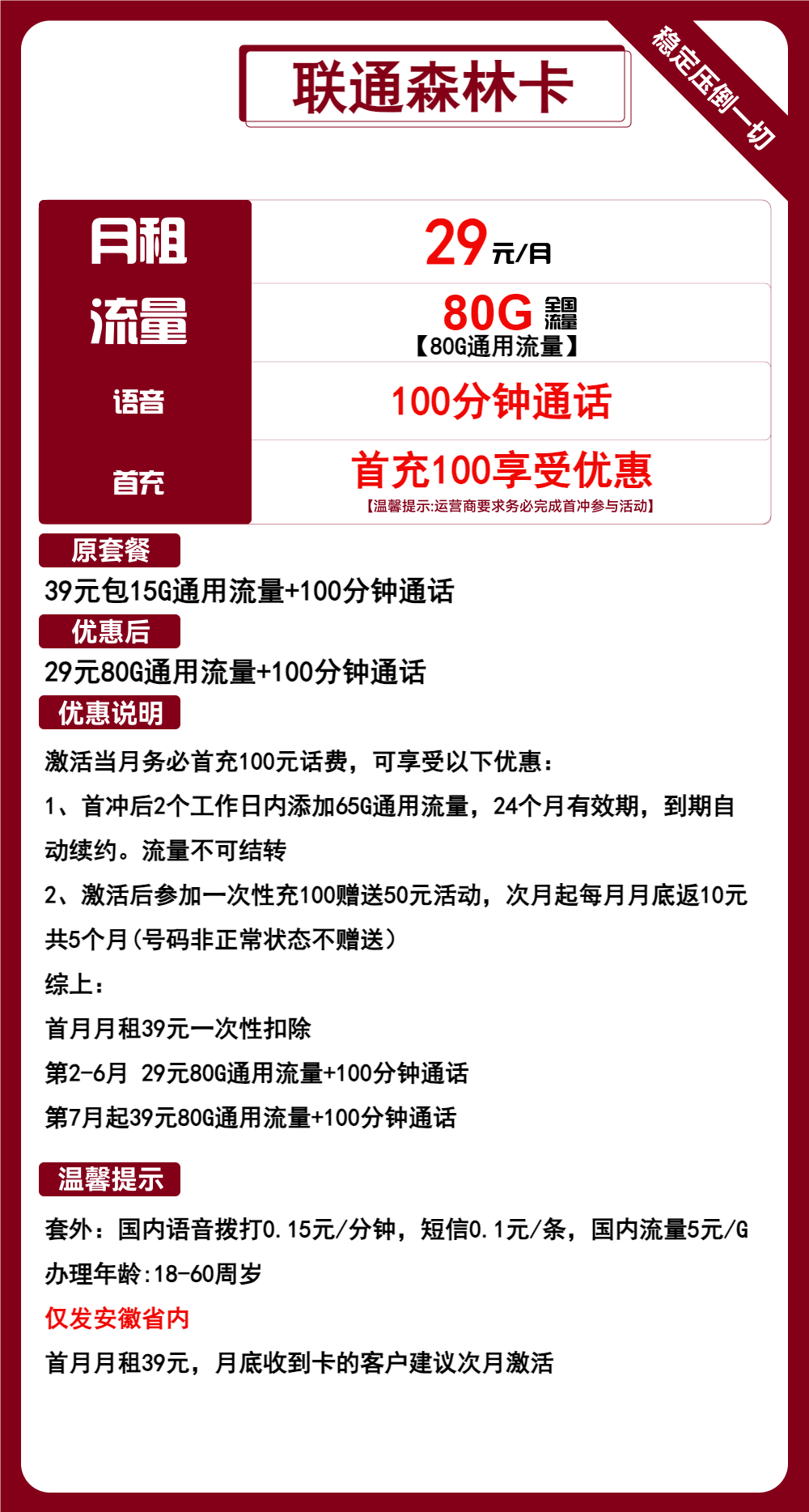 在移动互联网的大时代背景之下,流量与通信已然成为人们日常生活里不可或缺的关键部分。中国联通凭借其套餐内容超值这一巨大优势,深受广大用户的青睐。就在今天,我们要为您全方位地介绍联通森林卡的办理方式,此卡 29 元就能拥有 80G 通用流量和 100 分钟通话(从第 7 个月起月租为 39 元,这是长期套餐,不过仅面向安徽省内发放)。