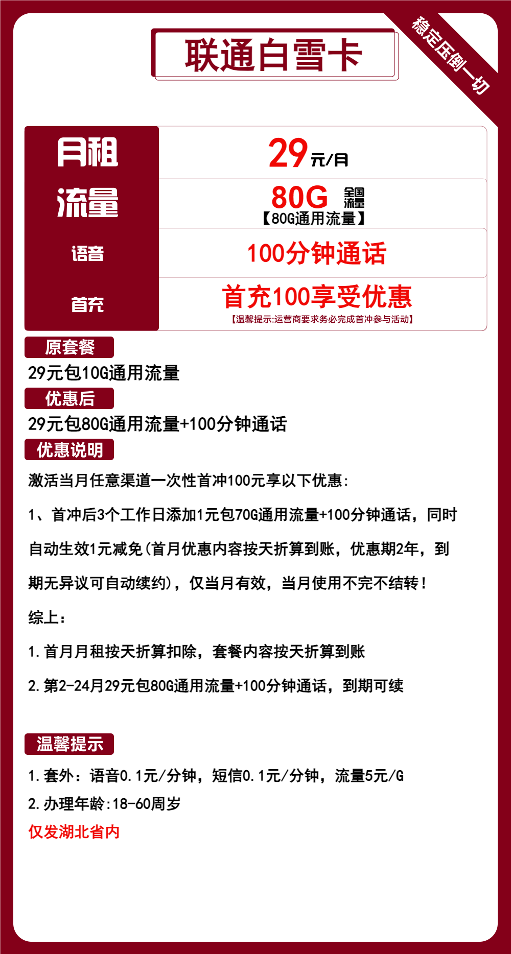 - 禁发区域:仅发湖北省(此套餐仅限于湖北省内用户订购和配送)