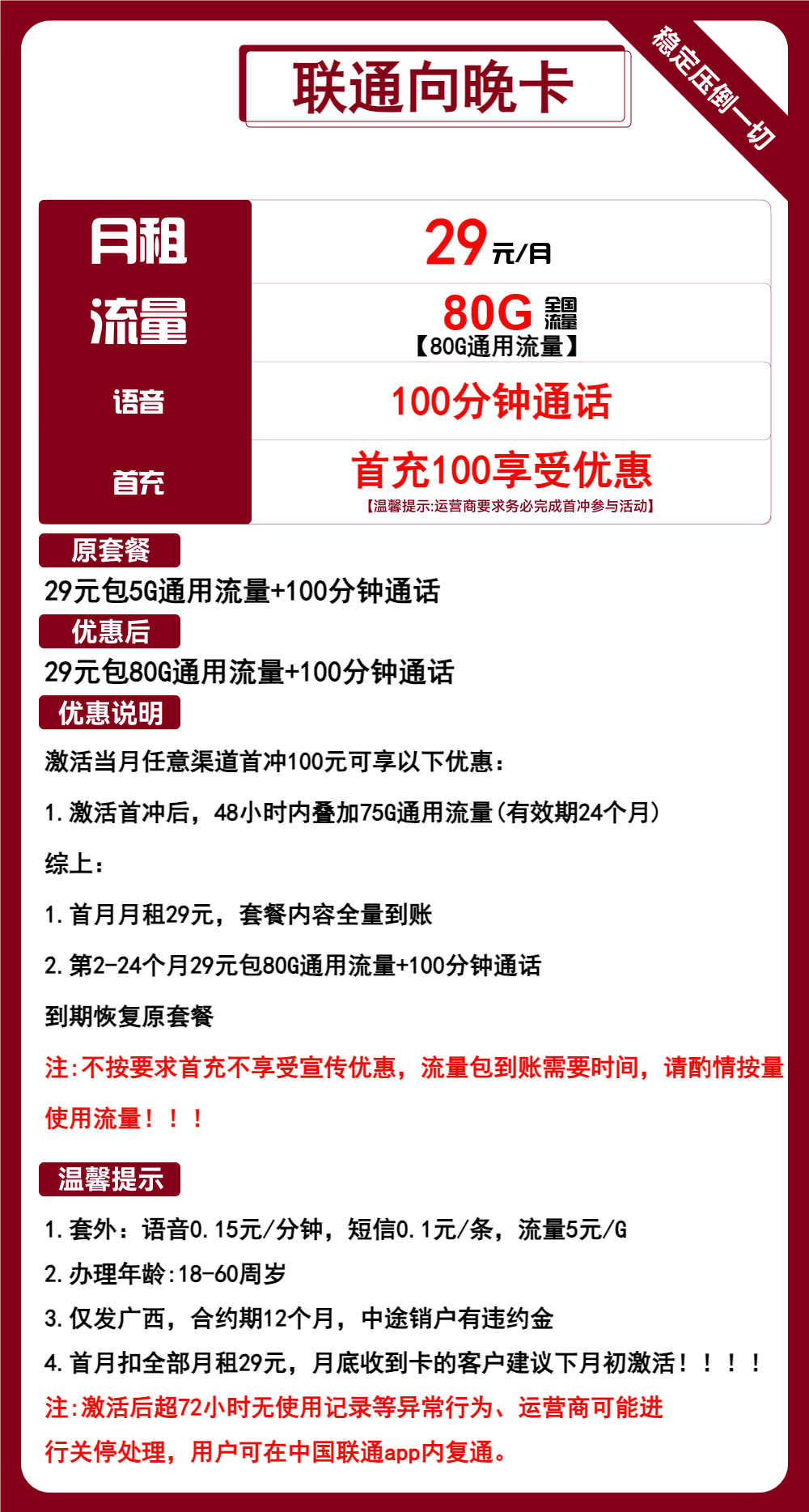 在当今社会,网络流量的关键意义是不言而喻的。中国联通的向晚卡①那可真是引人注目,它每月仅需 29 元,就包含 80G 的通用流量,还有 100 分钟通话呢(这可是 2 年的套餐哦,仅在广西省内发售,而且还能选号)。这一超值套餐,让大量年轻人心动不已。接下来,本文会对这张卡的资费情况、办理激活的规则,以及购卡时需要了解的事项进行详细阐述。