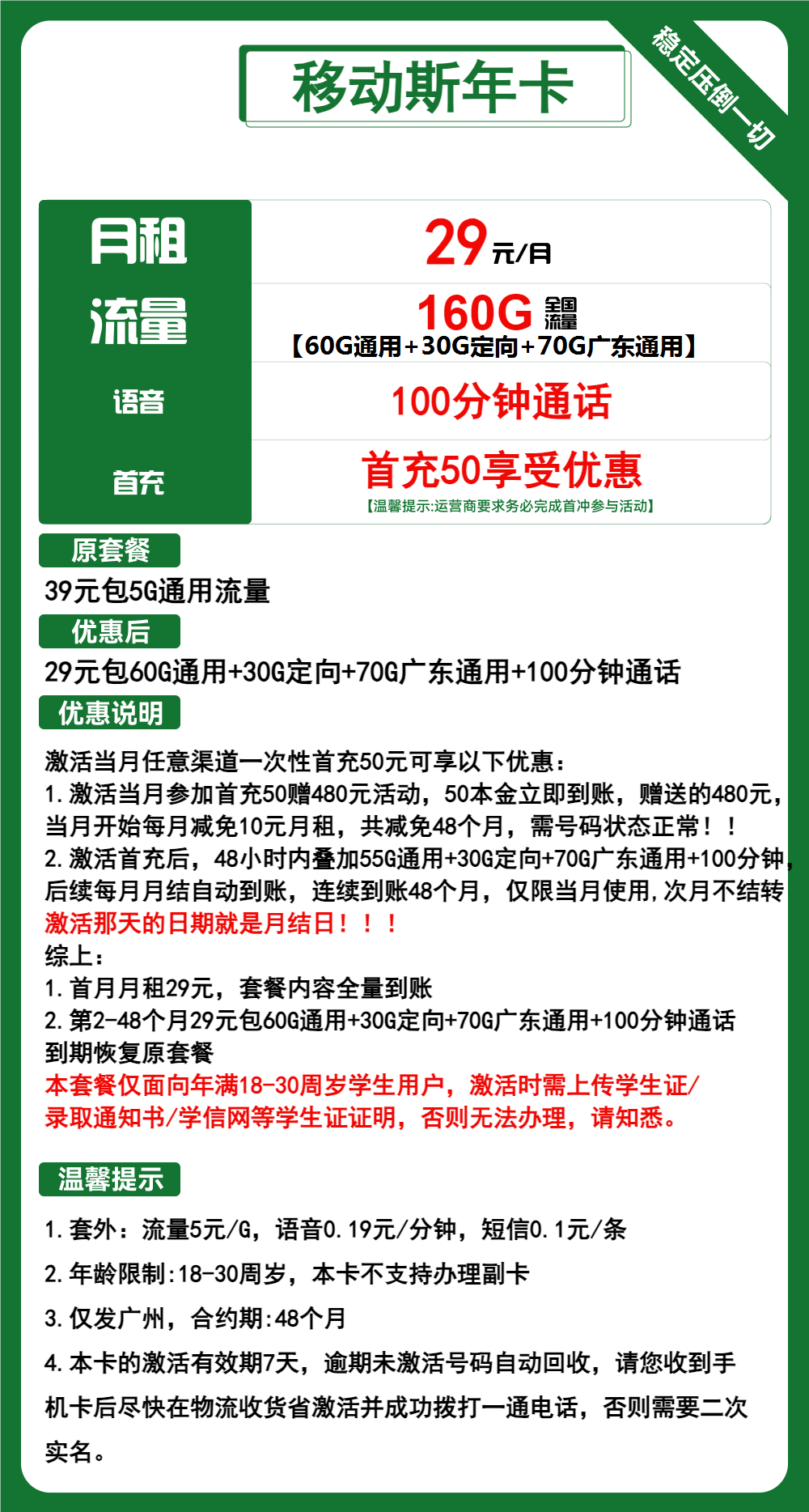近些年来,伴随着通信技术的持续发展,移动行业的竞争变得越发白热化。为了迎合消费者对于高速且稳定网络的需求,移动公司推出了一连串的优惠套餐。其中有移动斯年卡,每月 29 元,包含 130G 通用流量、30G 定向流量以及 100 分钟通话(此为 4 年套餐,需要学生证,仅发往广州市内)。接下来,我们将对这个极具吸引力的套餐进行详细介绍。