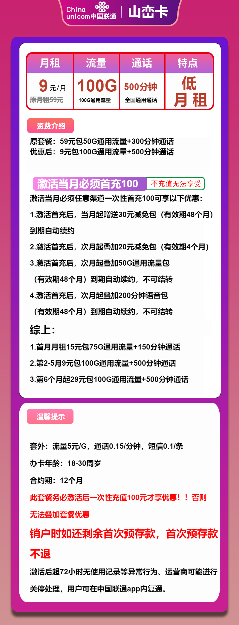 在如今这个 5G 浪潮汹涌来袭的时代,大批民众纷纷踏上寻找兼具海量流量与飞速网速套餐的征程。中国联通精心打造的山峦卡,宛如一颗璀璨新星强势登场。它打出了 9 元月享 100G 通用流量、外加 500 分钟通话时长,还附赠 1 年视频会员的震撼组合拳(需注意,从第 6 个月起月租调整为 29 元,不过这可是长期稳定的套餐,并且目前仅面向浙江省内发货),凭借着对 5G 网络的完美适配,迅速赢得了众多用户的倾心青睐。接下来,本篇文章就将全方位、深层次地为您剖析这款卡的套餐资费细节,手把手教您搞定这一超值套餐的办理流程。