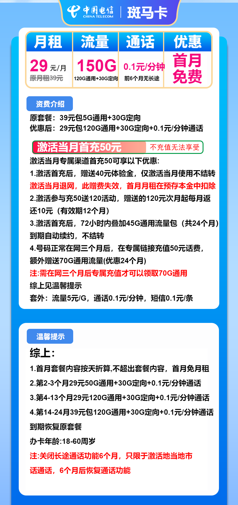 在当下这个互联网迅猛腾飞的时代浪潮里,网络已然深度融入我们的生活,成为难以或缺的关键部分。不管是忙碌的工作场景,还是日常的生活点滴,亦或是休闲娱乐的时刻,网络都如影随形。为全方位契合大家多种多样的上网需求,中国电信精心打造并推出了电信斑马卡。这款套餐极具吸引力,每月仅需29元,便能拥有120G通用流量,外加30G定向流量,拨打电话每分钟也仅需0.1元。值得一提的是,从第14个月开始,月租会调整为39元,不过套餐有效期长达2年,正因如此,它收获了众多用户的青睐。接下来,会为大家深入细致地介绍该套餐的具体内容,以及便捷的办理途径 。