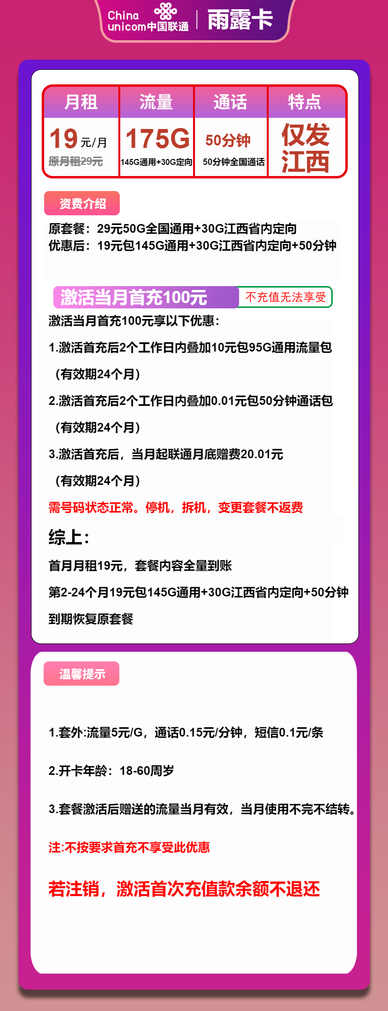 5G时代,大伙都热衷于寻觅大流量、高速率的套餐。中国联通顺势推出雨露卡,仅需19元,每月就能有145G通用流量、30G定向流量,还附带50分钟通话时长。这可是为期2年的套餐,虽说只发往江西,但凭借适配5G网络的优势,迅速赢得了当地用户的青睐。下面,为您详细剖析雨露卡的套餐资费,手把手教您如何办理这一实惠套餐。
