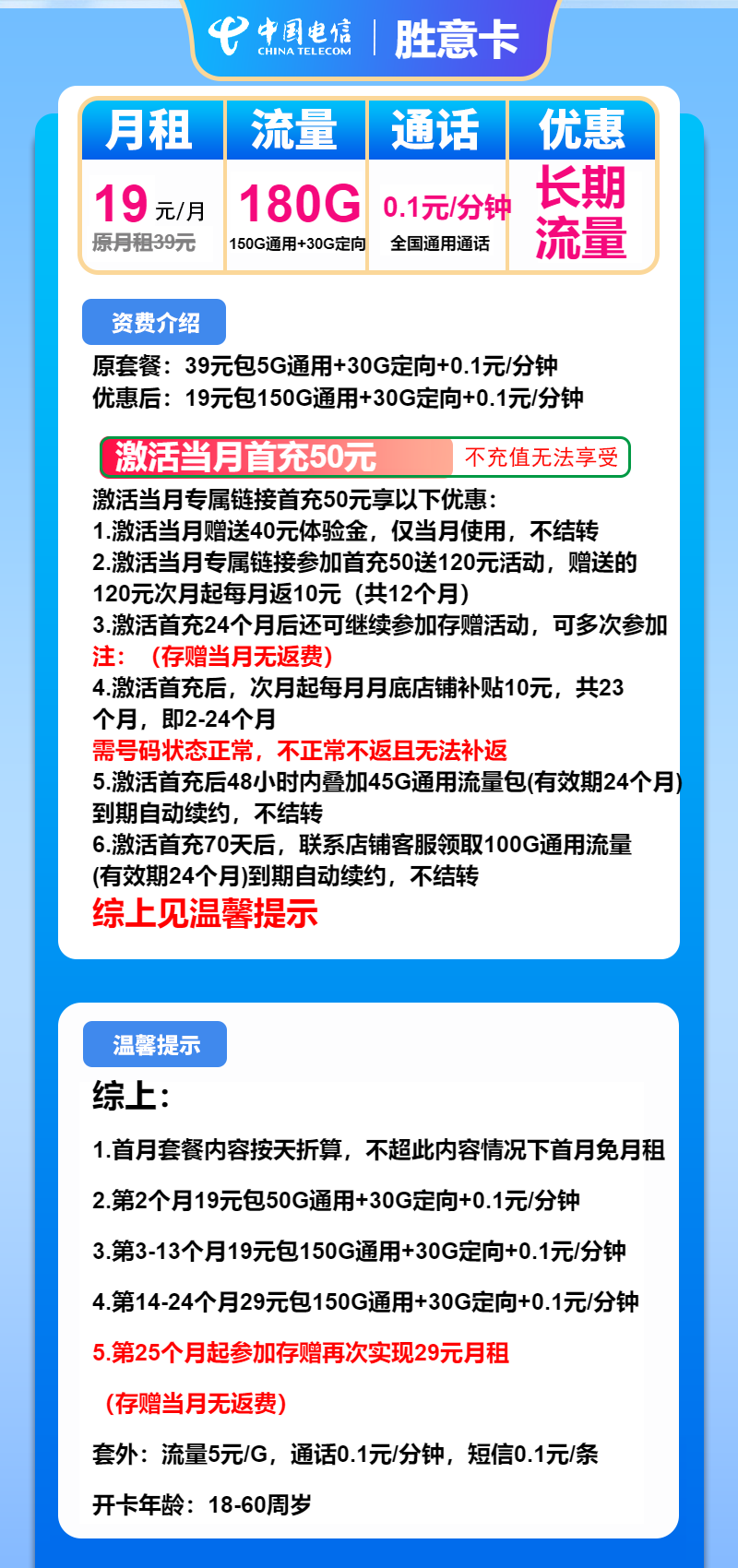 今天,就为大家详细解读中国电信胜意卡。这款套餐仅需 19 元 / 月,便能享受 150G 通用流量,外加 30G 定向流量,通话每分钟 0.1 元 。从第 14 个月起月租调整为 29 元,属于长期套餐。下面,我会着重讲讲这款套餐的优势,以及购买时需要留意的相关事项。