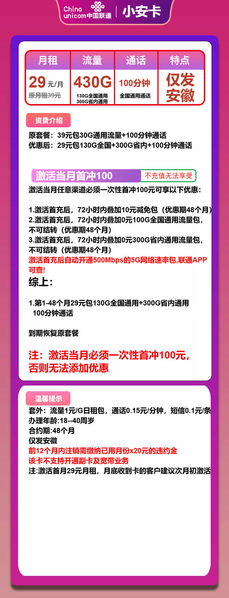 - 备注:请确保在安徽省内使用本套餐,并遵守相关合约规定。如有任何疑问或需要帮助,请联系中国联通客服。