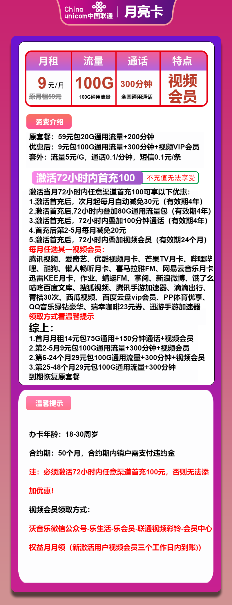 中国联通敏锐捕捉到用户对流量的高需求,重磅推出了极具吸引力的月亮卡。令人心动的是,这款卡前 5 个月每月仅需 9 元,用户就能畅享 100G 通用流量、300 分钟通话时长,还能获得视频会员权益。从第 6 个月起,月租调整为 29 元 ,套餐有效期为 4 年,额外赠送 2 年视频会员,并且仅面向浙江省内发行。如此超值的套餐组合,成功吸引了众多追求性价比的年轻人目光。