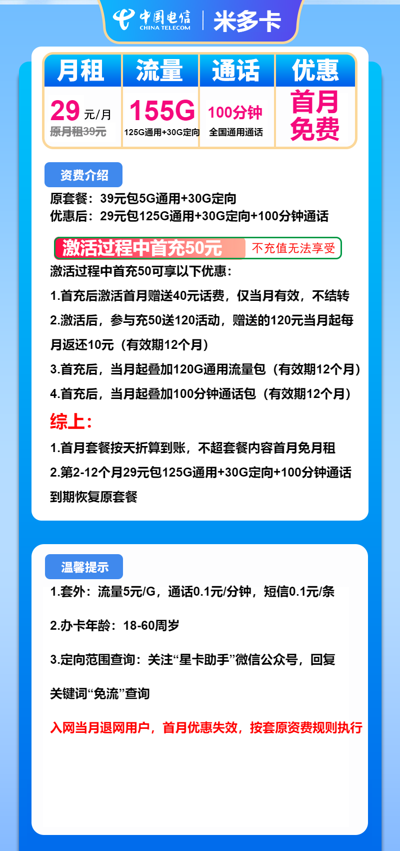 在当下这个节奏飞快的时代,移动互联网早已深度融入人们的生活,成为不可或缺的存在。随着大家对网络需求与日俱增,各大运营商为了抢占市场,接连推出形形色色的优惠套餐。在众多套餐里,中国电信米多卡推出的这款套餐就十分亮眼,每月仅需29元,便能拥有125G通用流量、30G定向流量,外加100分钟通话时长,并且这个套餐的优惠期长达1年 ,性价比超高,极具吸引力。